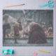 This heartwarming winter scene captures a moment of quiet wonder as a majestic reindeer a child dressed in a red, patterned coat and Santa are exchanging a gift. Beside them, an elderly man in a long red robe kneels with a glowing lantern, casting warmth into the snowy twilight. Soft lights shimmer in the background, evoking a sense of folklore, faith, and seasonal storytelling. The composition radiates tenderness, reverence, and the magic of intergenerational connection—perfect for holiday décor, devotional crafting, or rustic winter narratives.