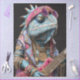 rockstar chameleon artwork, whimsical reptile decoupage panel, pink electric guitar animal design, RHDesigns mixed media paper, glam lizard collage, gold jewelry chameleon art, denim jacket reptile decor, handcrafted furniture panel, bold seasonal paper, layered whimsical imagery, joyful fantasy collage, holiday tray design, playful lizard decor paper, RHDesigns by 2ChattyChicks, vibrant DIY animal project, musical reptile crafting paper, anthropomorphic chameleon rocker, glam rock animal art.