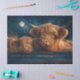 Two shaggy Highland sweethearts rest their heads on a hay-filled blue trough, bathed in moonlight and surrounded by stars. Their peaceful gaze and cosy pose turn this rustic moment into pure magic. With a full moon glowing above and a cosmic sparkle in the air, this scene blends barnyard charm with celestial serenity. It’s a quiet night, a tender bond, and a reminder that even under the stars, love finds its way to the hay bale.