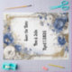 Ornate floral save the date, blue and white flowers, gold leaves, elegant and sophisticated design, suitable for formal events, luxurious blue and gold colours