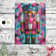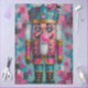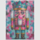This bold and bubbly nutcracker bursts with personality—painted in vibrant pink, turquoise, and gold, with a cheeky grin and heart-shaped eyes twinkling with starry sparkle. A large blue crown with pink accents tops the look, while gold epaulettes, buttons, and belt add regal flair. The textured background of splattered pinks, blacks, and whites creates a dynamic winter wonderland, perfect for holiday trays, furniture panels, or layered mixed media projects.
