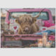 Highland cow, pink pickup truck, cosy decorations, blankets and pillows, heart designs, rustic charm, wicker basket, whimsical scene, evening setting, RHDesigns by 2chattychicks.
