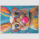The image is a colourful and artistic depiction of a bunny. The bunny is wearing large, round glasses with red frames and is blowing a pink bubblegum bubble. The background is a vibrant blue with splashes of various colours, including yellow, pink, and orange, adding to the playful and whimsical nature of the artwork. The bunny's fur is detailed with shades of orange, yellow, and white, contributing to the overall lively and cheerful aesthetic of the image. This unique and eye-catching artistic style combines realism with a playful, cartoon-like quality.