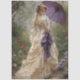 A graceful woman stands in a lush forest, dressed in a cream-colored vintage gown with lace and ruffles. Her purple parasol contrasts vividly with the greenery, while white flowers adorn her elaborate updo. Perfect for decoupage, mixed media, or furniture art that celebrates romantic elegance, historical fashion, and nature’s quiet beauty.