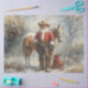 Saddle up for the season with this Western Cowboy Santa—a heartwarming fusion of holiday tradition and frontier grit. Dressed in a red coat trimmed with white fur, cowboy boots, brown gloves, and a wide leather belt, Santa stands beside his trusty horse in a snow-covered landscape. His cowboy hat replaces the classic cap, adding a rustic twist to his timeless look. A red sack rests nearby, hinting at gifts ready to be delivered across the prairie.