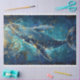 A vibrant and artistic representation of a whale ascending through water with a cosmic, starry background that gives the impression of space. The use of blue hues and splashes of gold creates a dynamic and almost surreal visual effect. “RHDesigns by 2chattychicks” is digital art created for furniture flippers, home decor and more.