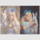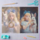 Meet a couple of little blonde girls that are the dreamer of adventures! They are clutching golden pocket watches, a hint that time is of the essence. Is it time for Easter maybe? Perched on her shoulder is the ever-curious white rabbit, urging her to hurry and the other is waiting patiently. She is wearing a blue dress to add to her whimsical charm