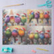 Check out these adorable festive feathered friends! Four colourful birds are perched on a string, each sporting a tiny Santa hat. They're set against a backdrop featuring a beautifully decorated Christmas tree. The birds' vibrant colours—purple, red and yellow, blue and purple, and green and yellow—add to the charm. The string they’re perched on is festooned with shiny baubles in red, green, gold, purple, and yellow, with gentle snowflakes falling to complete the holiday magic.