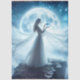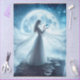 Bathed in starlight and moon glow, this luminous figure stands poised on a rocky cliff, her flowing white gown and veil billowing like whispers from another realm. With silver hair cascading in the wind and a glowing orb cradled gently in her hands, she gazes into its light as if reading the secrets of the universe. The full moon looms large behind her, casting a celestial halo across the night sky, while stars shimmer like silent witnesses to her ritual.