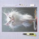 This digital art piece features an anthropomorphised long-haired white cat with striking yellow eyes and a grumpy expression. The cat stands upright against a simple grey background with colourful paint splatters at the bottom edge, highlighting its fluffy fur and unique personality. The illustration captures a blend of realism and whimsy, making it a charming and eye-catching piece.