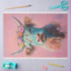 Highland cow with a crown of flowers, set against a pink background. The cow’s long, shaggy hair is rendered in vibrant shades of blue, orange, and white, creating a whimsical and colourful portrait. The calm and neutral expression of the cow adds to the serene and charming atmosphere of the artwork. This piece beautifully combines elements of rustic charm with artistic flair, making it a delightful addition to any collection