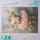 The image features a whimsical painting of a Highland cow adorned with human-like accessories. The cow is wearing a pink tutu and has a pink bow on its head, standing against an abstract textured background that suggests a rustic setting. The cow appears to be holding a coffee cup with an ornate design. This humourous and anthropomorphic portrayal of the cow blends elements of farm life with playful, creative touches, making it an amusing and eye-catching piece of art.