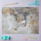 The image is a detailed and artistic painting of a Highland cow's head. The cow has long, shaggy white and light brown fur covering most of its face, with one visible eye looking directly at the viewer. The cow's horns are prominent, curving upwards. The background is a blend of muted, earthy tones with abstract floral elements in gold and brown, giving the painting a whimsical and natural feel. The combination of the realistic depiction of the cow and the abstract floral background makes the image visually striking and interesting.
