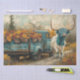 A whimsical and vibrant scene featuring a colourful highland longhorn standing proudly in front of an old-fashioned blue pickup truck loaded with baskets of bright yellow sunflowers. Set in a misty field with trees in the background, this artwork captures a serene and rustic atmosphere. These designs are created by RHDesigns of 2chattychicks for use with decoupage tissue paper, perfect for enhancing furniture, scrapbooking projects, canvas artwork, poster art, and home decor.