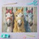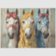 This illustration features three beautifully adorned country-style horses, each with vibrant bows and matching reins that enhance their rustic charm. On the left, the graceful white horse wears a striking red bow with coordinating reins, adding a bold yet elegant touch. In the centre, the golden-hued horse is accented with a cheerful yellow bow, while delicate white daisy flowers are sprinkled across her body, creating a soft, natural aesthetic. The rightmost horse is a stunning blue shade, complemented by a matching blue bow and harness adorned with white daisies, giving it a serene and enchanting look. The weathered background amplifies the countryside feel, making this design perfect for decoupage projects, craft paper, or decorative artwork with a Western-inspired, vintage appeal.