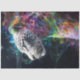 This mesmerising artwork portrays a close-up of a leopard's head, featuring its striking white coat with distinct black spots and piercing, vivid blue eyes. The image is brought to life with a vibrant array of swirling patterns and smoke-like effects in rich shades of blue, green, purple, orange, and pink. The dark background enhances the intensity of the colours and the intricate details of the leopard's face, creating a bold contrast. The fusion of realistic animal imagery with abstract, dynamic art elements lends this piece a captivating and imaginative quality, evoking a sense of power and mystique.