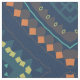 Trendy unique fabric design in ethnic style featuring a seamless pattern made of geometric shapes in yellow, orange, brown and turquoise on a deep blue background.