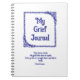 Writing in a grief journal is a comforting way to deal with sorrow. A deep blue ornate border with flourishes in two corners surrounds the title, "My Grief Journal." The quote, "Give sorrow words; the grief that does not speak knits up the o’er wrought heart and bids it break,” by William Shakespeare is displayed below the title. The quote is a reminder that writing about your grief can be a truly helpful way to deal with your grief. You can customise the title with your own title and quote if desired. A matching sheet of stickers featuring additional quotes is available.