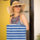 Classic beach towel with cabana stripes in deep blue ( #004095) and white . Personalise it now with a name . You can also add a monogram /logo etc . Design by Alma Wad .