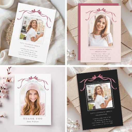 Invite friends and family to celebrate the graduate with this elegant invitation, featuring a deep blush ribbon bow with a arch photo.