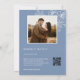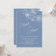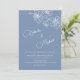 Minimalist design with white floral sketch cherry blossoms and on a dusty blue background. Modern botanical hand drawn wedding invitation with bride and groom names in an elegant calligraphic script. With your photo on the backside.
