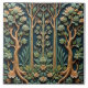 Symmetrical composition of three stylised trees with golden trunks and green foliage, set against a dark teal background, intricate floral patterns , nature-inspired design, decorative art.