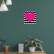 Deep pink heart shape against a black and white zigzag or chevron pattern.