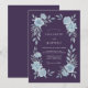 Rich eggplant and deep plum tones provide a striking backdrop for icy pale blue botanical illustrations. Soft watercolor roses and delicate hydrangeas are nestled among frosty foliage to create a sophisticated evening aesthetic. This serene palette evokes a formal atmosphere for a winter night. Elegant leaves sweep across the design for an organic yet refined artistic arrangement.