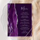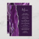 The left-hand edge of this elegant modern wedding menu features a purple watercolor agate border trimmed with faux silver glitter. The customisable text combines silver grey handwriting script and copperplate fonts on a deep purple background. The reverse side features a matching purple and silver agate design.