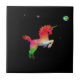 Black acts as the foil for this spectacular colour display created by a motif of unicorn and distant planets.