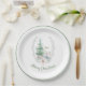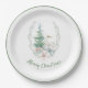 Christmas themed paper plates, with a thin green border around the edge and beautiful watercolor graphics of a white deer and Christmas tree. Custom green text, on the bottom, can be personalised to read what you want.