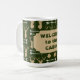 This is a cute mug which is perfect to use for a guest at a cabin or woodland home. It features a pattern of light gold buck deer head silhouettes and white arrows on a background of dark forest green. At the centre is a matching label with your custom text, also in dark forest green. Currently it says "WELCOME to the CABIN" but you may easily customise it to your own text.
