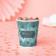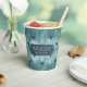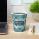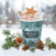 This paper cup design features a trendy pattern of deer head silhouettes with curving antlers, stylised arrows and tiny snowflakes in dark teal on a textured-effect, watchet blue background. Optional 'Happy Holidays' text and a label have been provided to add your name and/or other text. Search ID861 thru ID864 to see additional colour options and other products in this modern, Christmas design set.
