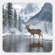 A beautiful landscape featuring a deer beginning to cross a river in winter, surrounded by majestic mountains and snow-laden trees. Perfect for anyone who loves nature and the outdoors.