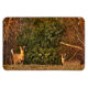 This fine art flexible magnet features an early morning sunrise with two brown white-tailed deer (odocolleus virginianus) who have been sleeping at the foot of a green evergreen tree. Their eyes, neck and tail are white. The forest is tinged with orange light.