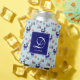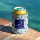 A can cooler with a repeating pattern. Illustrated with a pair of blue scandinavian deer wearing red scarves. With decorative markings on their bodies. As well as a trio of red and blue christmas trees with a star on top. Fancy snowflakes sprinkled around. A square layered over top with your personalised monogram initial and name.