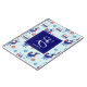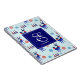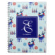A spiral notebook with a repeating pattern. Illustrated with a pair of blue scandinavian deer wearing red scarves. With decorative markings on their bodies. As well as a trio of red and blue christmas trees with a star on top. Fancy snowflakes sprinkled around. A square layered over top with your personalised monogram initial and name.