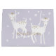 NewParkLane - Cute Christmas Gift Bag, with a pattern of deer and a snowy background in soft lilac / lavender. With quote: 'Merry Christmas' in gold script typography.