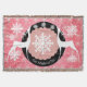 Beautiful Christmas holiday throw blanket features a background of pink with white snowflakes, a ring of solid black with a few white snowflakes, and a centre of pink with tiny white polka dots. Two white deer silhouettes adorn this pretty holiday throw and there's an area you can easily personalise with your family name.