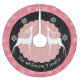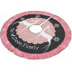 Beautiful Christmas holiday tree skirt features a background of pink with white snowflakes, a ring of solid black with a few white snowflakes, and a centre of pink with tiny white polka dots. Two white deer silhouettes adorn this pretty holiday tree skirt and there's an area you can easily personalise with your family name.
