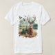 This white t-shirt features a detailed illustration combining elements of wildlife and rural life. A large buck with impressive antlers stands in tall grass near a green and yellow tractor. Several mallard ducks are depicted flying overhead. The background shows a landscape with a body of water, trees, and a hazy sky. This design suggests themes of hunting, nature, and farming.