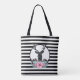 A tote bag personalised with monogram letters. Designed with a black deer head with large antlers. Geometric lines inside the face of the deer adds a creative touch. Colourful pink flowers and mint green leaves form a pretty floral bouquet below his head. A mountain range sketch placed amongst the flowers also adds to the rustic country feel. Background is a black and white striped pattern.