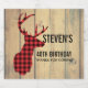 Beer bottle label with a rustic style. Designed with a deer head with antlers, made of red plaid. A fancy oval frame surrounds the image. An image of wood planks for the background gives it an outdoorsy country feel.