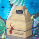 A party favour box with a rustic style. Designed with a deer head with antlers, made of red plaid. . An image of wood planks for the background gives it an outdoorsy country feel.