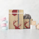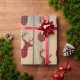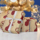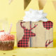 Wrapping paper with a rustic style. Designed with a repeating pattern of a deer head with antlers, made of red plaid. An image of wood planks for the background gives it an outdoorsy country feel.