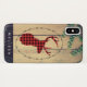 Casemate case with a rustic style. Designed with a deer head with antlers, made of red plaid. A fancy oval frame surrounds the image. An image of wood planks with green ivy leaves for the background give it an outdoorsy country feel. The bottom border has a dark blue pattern with sprigs and leaves with a personalised ame written over top.