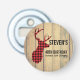 Birthday favour bottle opener with a rustic style. Designed with a deer head with antlers, made of red plaid. An image of wood planks for the background gives it an outdoorsy country feel.