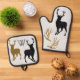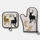 Oven mitt and pot holder set for the outdoorsman who hunts. Deer and antlers design in black, tan and grey. The pot holder has a template to add a first name initial in a grunge font.