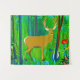 Tapestry in a stylised illustration of a deer in a fairytale forest setting, surrounded by trees and plants, in shades of brown and green