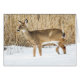 A white tailed deer stands in a snowy field with tall reeds in the background.